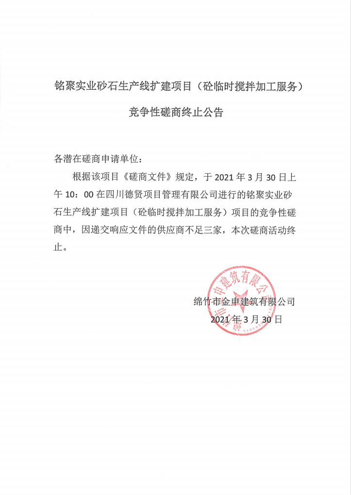 銘聚實(shí)業(yè)砂石生產(chǎn)線砼臨時(shí)攪拌加工競(jìng)爭(zhēng)性磋商終止公告