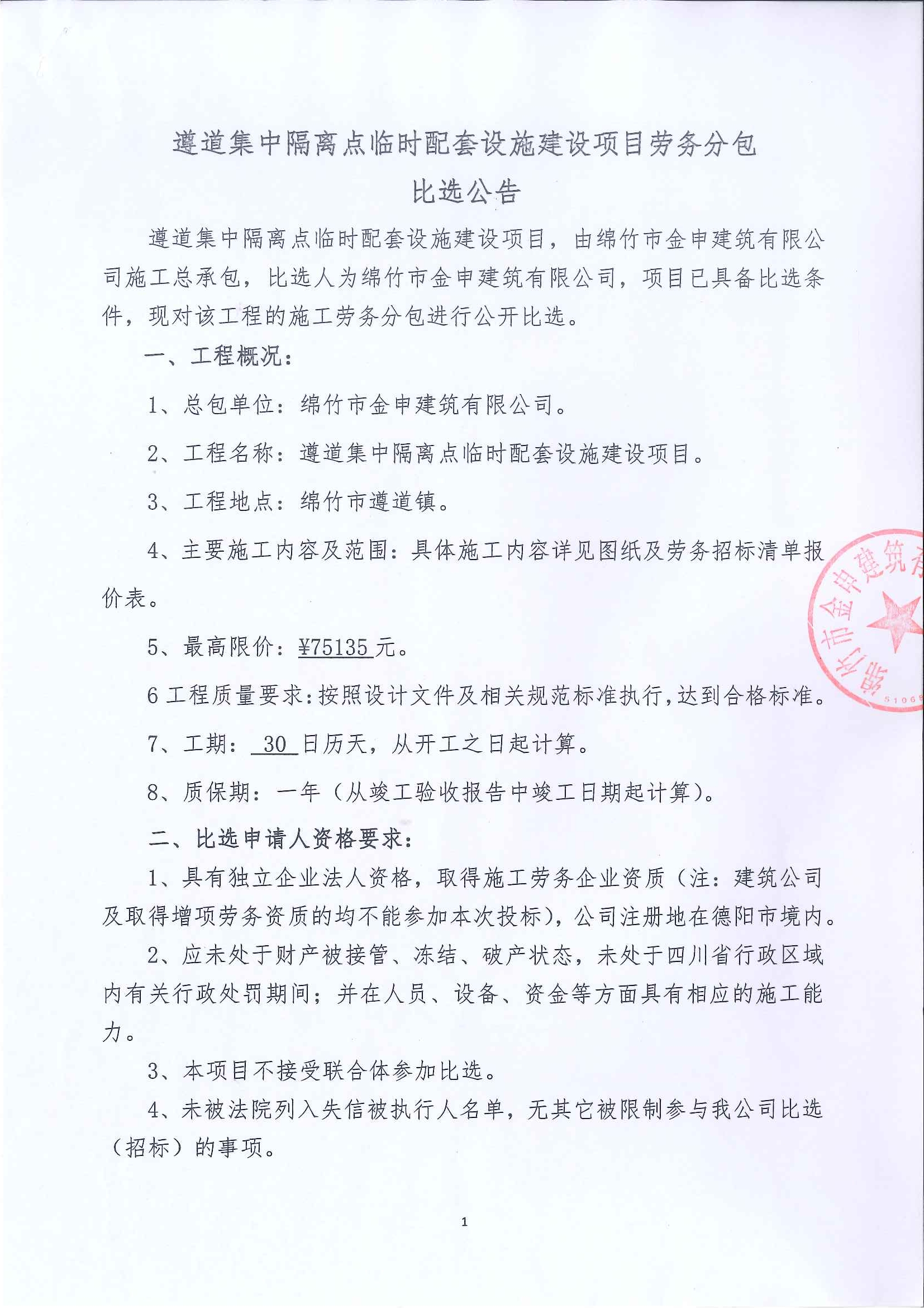 遵道集中隔離點臨時配套設(shè)施建設(shè)項目勞務(wù)分包比選公告