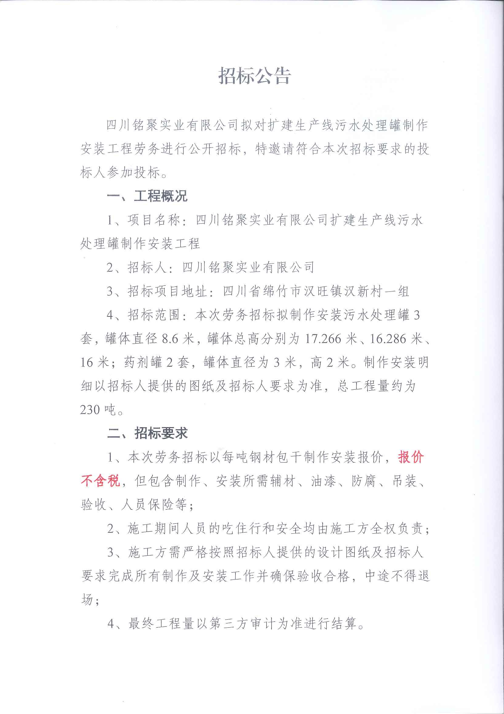 擴(kuò)建生產(chǎn)線污水處理罐制作安裝工程招標(biāo)公告