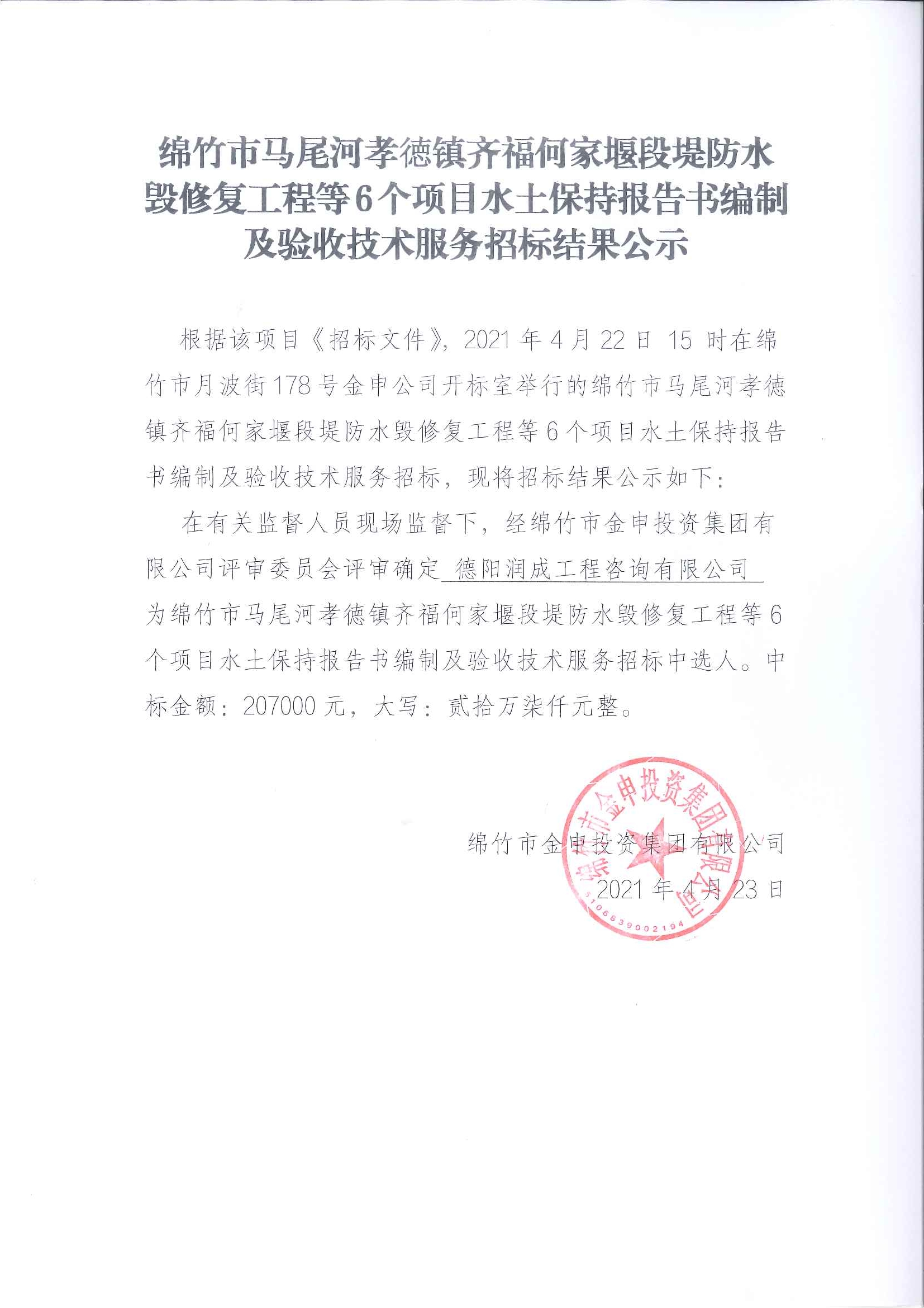 馬尾河何家堰段水毀等6個(gè)項(xiàng)目水保編制服務(wù)招標(biāo)結(jié)果公示