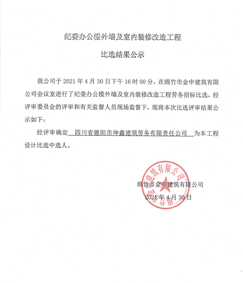 紀委辦公樓外墻及室內裝修改造工程勞務分包比選結果公示