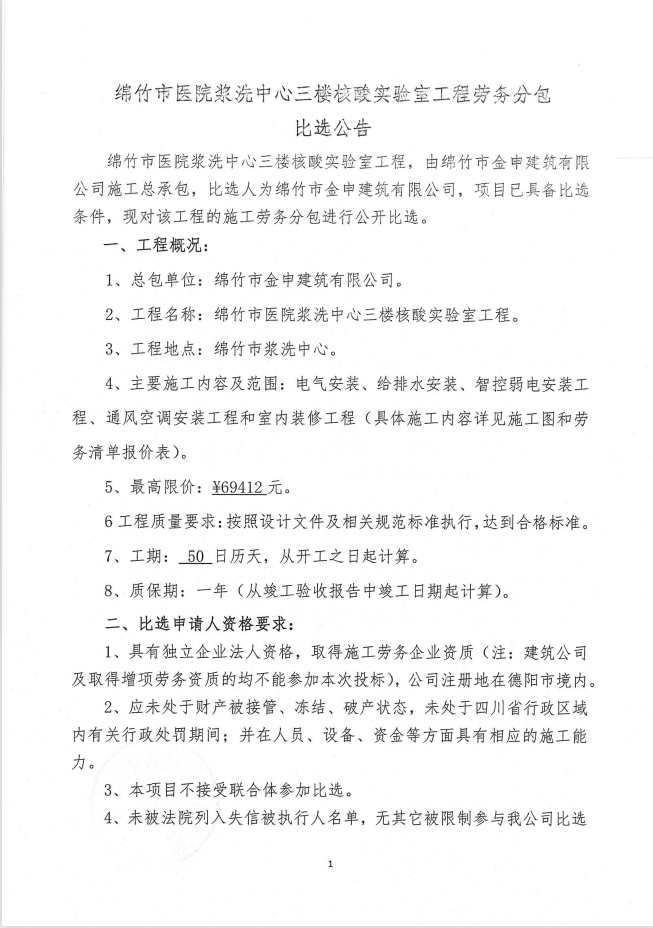 綿竹市醫(yī)院漿洗中心三樓核酸實驗室工程勞務(wù)分包比選公告