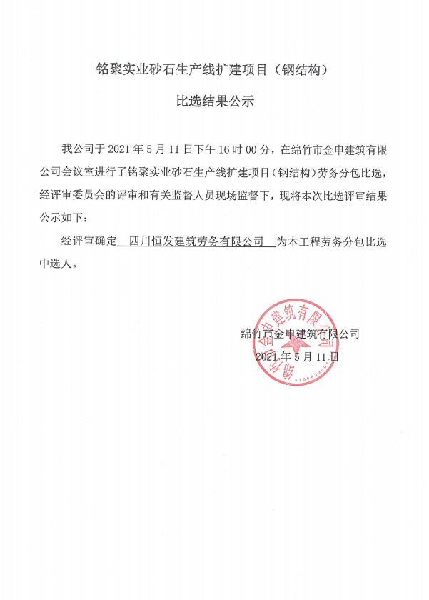 銘聚實業(yè)砂石生產(chǎn)線擴建項目(鋼結(jié)構(gòu))比選結(jié)果公示