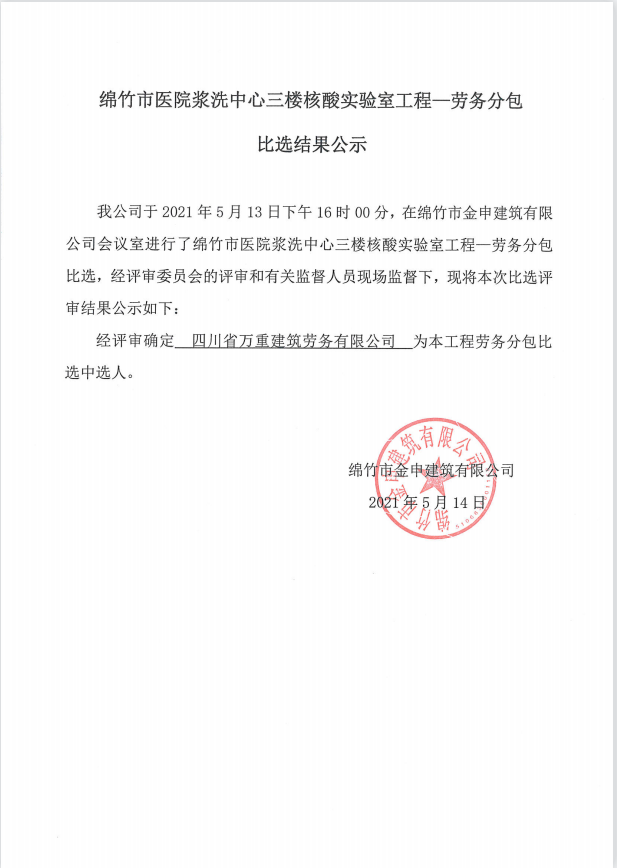 市醫(yī)院漿洗中心三樓核酸實驗室工程勞務分包比選結果公示