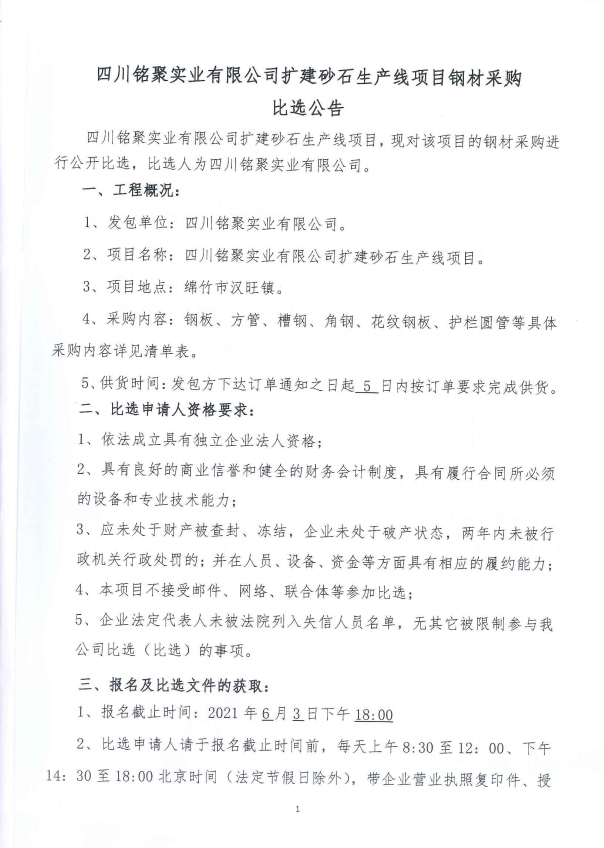 銘聚公司擴(kuò)建砂石生產(chǎn)線項(xiàng)目鋼材采購(gòu)比選公告