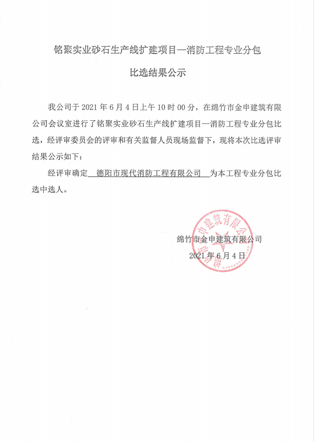 銘聚實業(yè)砂石生產(chǎn)線擴建項目—消防工程分包比選結(jié)果公示