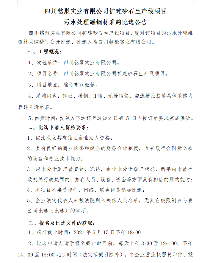 銘聚實(shí)業(yè)擴(kuò)建砂石生產(chǎn)線項(xiàng)目污水處理罐鋼材采購(gòu)比選公告