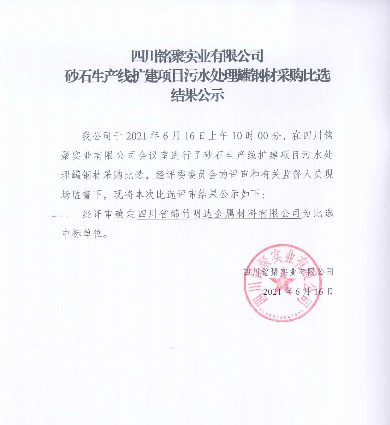 銘聚實(shí)業(yè)擴(kuò)建砂石生產(chǎn)線項(xiàng)目污水處理罐采購比選結(jié)果公示