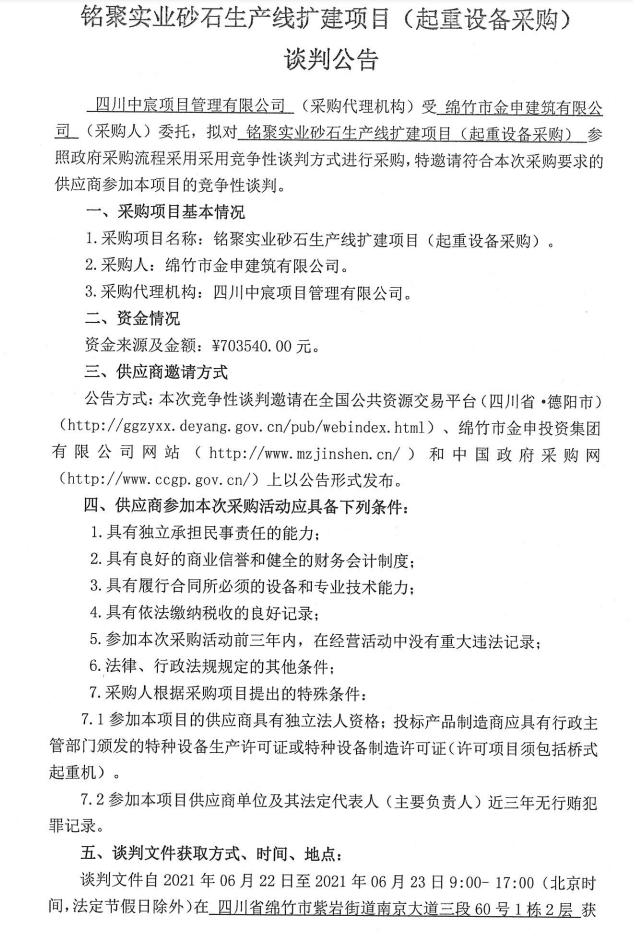 銘聚實業(yè)砂石生產線擴建項目起重設備采購談判公告