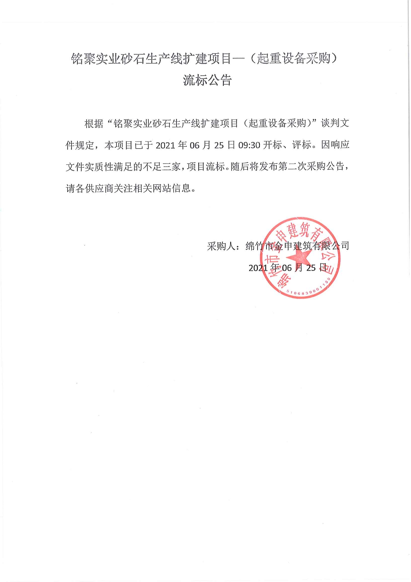 銘聚實(shí)業(yè)砂石生產(chǎn)線擴(kuò)建項(xiàng)目-(起重設(shè)備采購)流標(biāo)公告