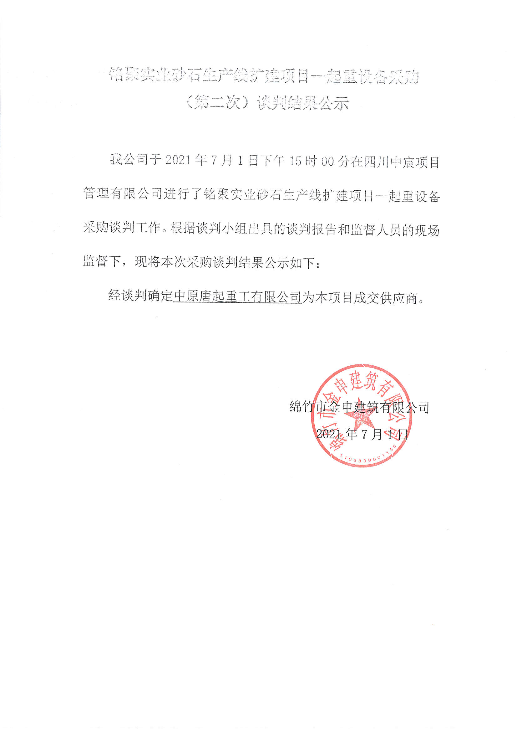 銘聚實業(yè)砂石生產(chǎn)線擴建項目起重設(shè)備采購談判結(jié)果公示