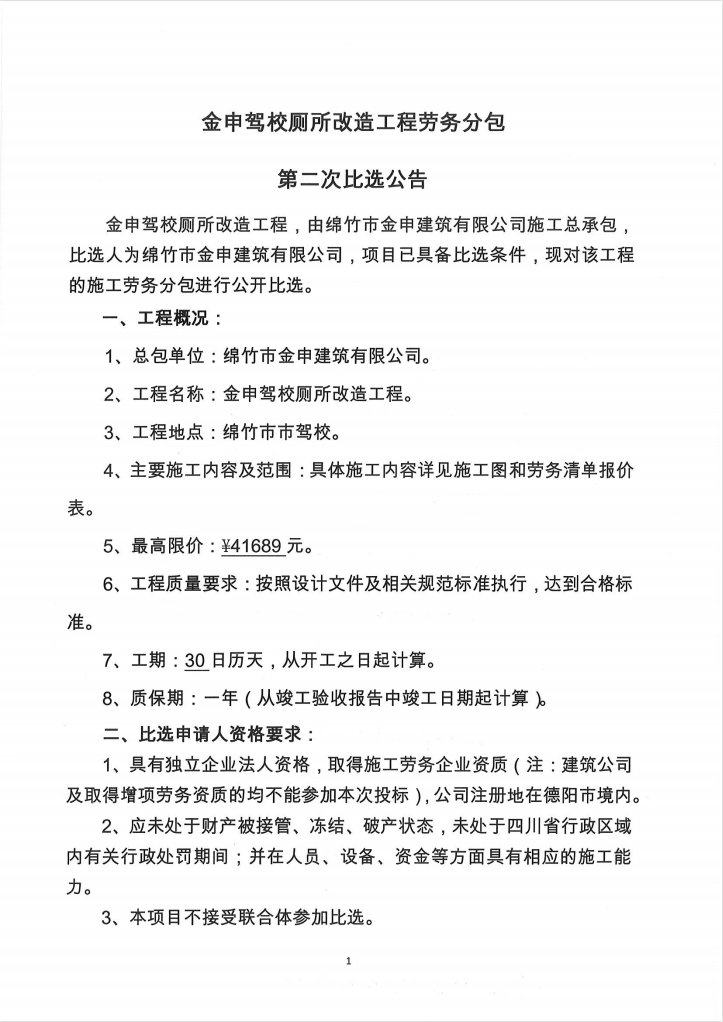 金申駕校廁所改造工程勞務(wù)分包第二次比選公告