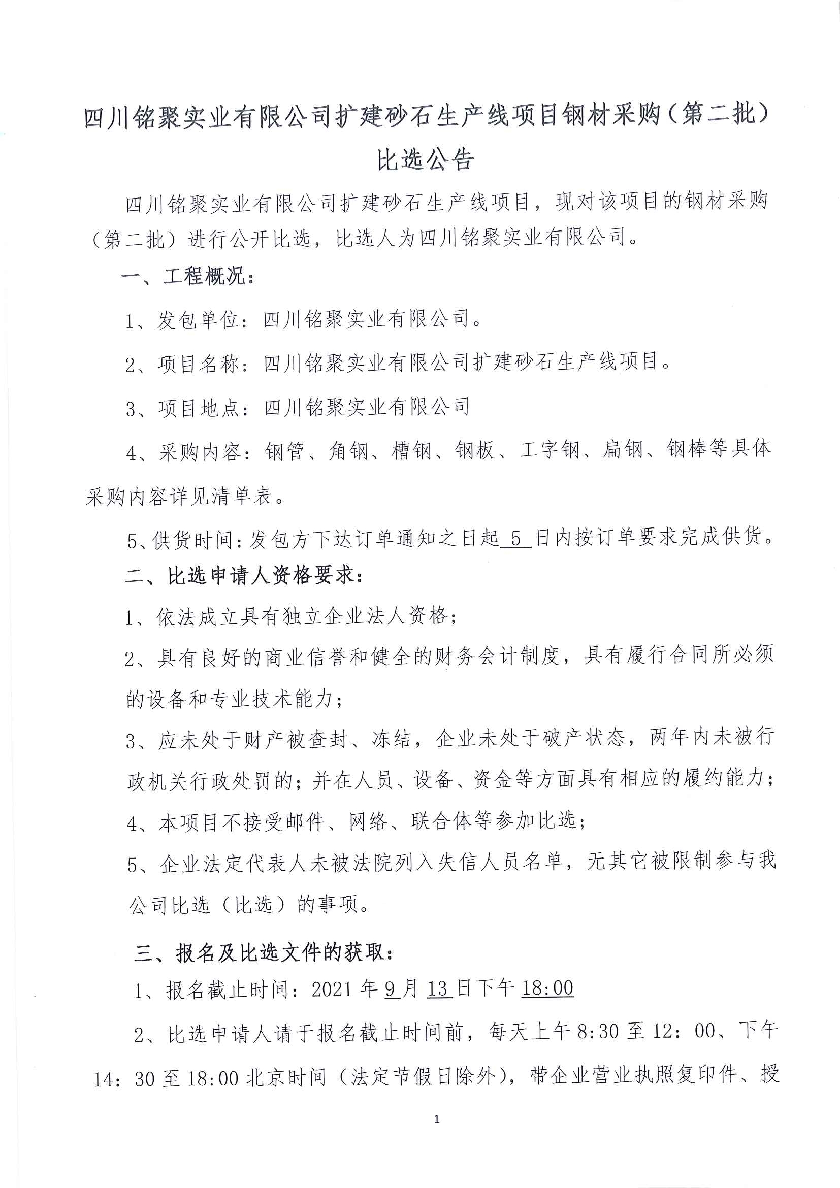 銘聚公司擴(kuò)建砂石生產(chǎn)線項目鋼材采購(第二批)比選公告