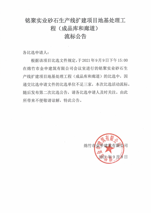 銘聚實業(yè)砂石生產(chǎn)線擴建項目地基處理工程流標公示