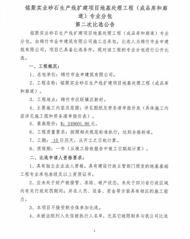 銘聚砂石生產(chǎn)線擴建項目地基處理工程第二次招標比選公告