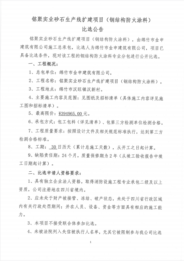 銘聚實業(yè)砂石生產(chǎn)線擴建項目(鋼結(jié)構(gòu)防火涂料)比選公告