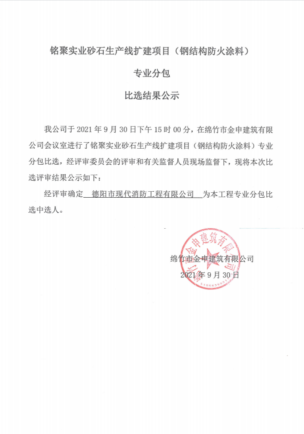 銘聚砂石生產(chǎn)線擴(kuò)建項(xiàng)目(鋼結(jié)構(gòu)防火涂料)比選結(jié)果公示