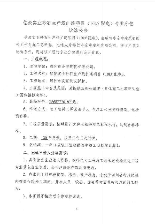 銘聚砂石生產(chǎn)線擴(kuò)建項(xiàng)目(10kV配電)專業(yè)分包比選公告