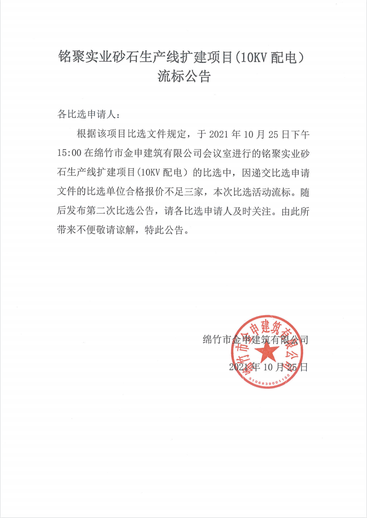 銘聚實(shí)業(yè)砂石生產(chǎn)線擴(kuò)建項(xiàng)目(10kV配電)流標(biāo)公告