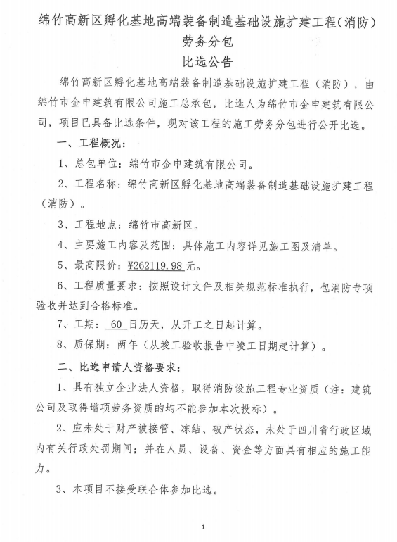 高新區(qū)高端裝備制造基礎(chǔ)設(shè)施(消防)勞務(wù)分包比選公告