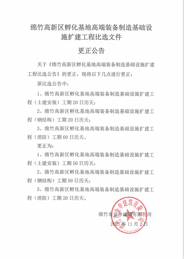 高新區(qū)孵化基地高端裝備制造基礎設施擴建工程更正公告