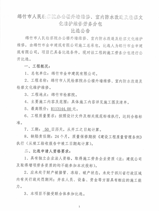 市檢察院外墻維修、室內(nèi)防水等改造維修工程比選公告