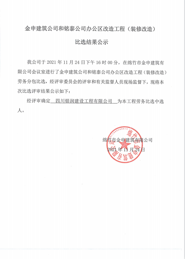 建筑、銘泰公司辦公區(qū)改造工程比選結(jié)果公示