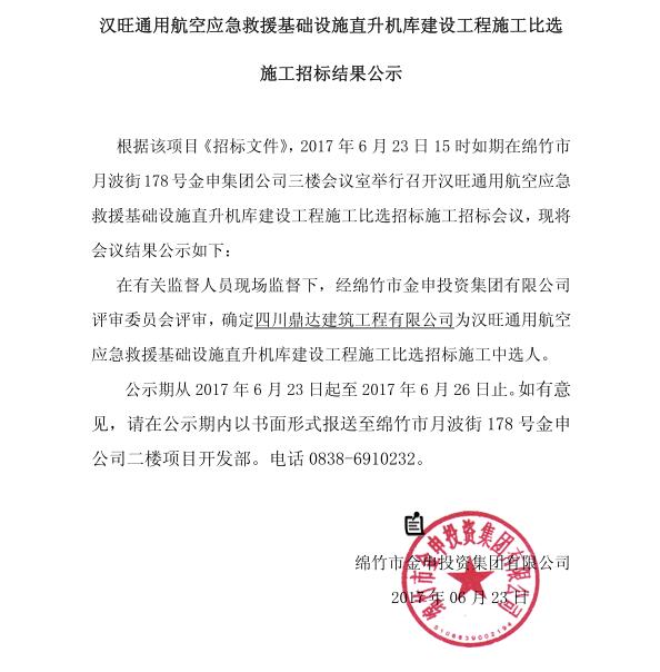 漢旺通用航空應(yīng)急救援直升機(jī)庫(kù)工程施工比選招標(biāo)結(jié)果公示