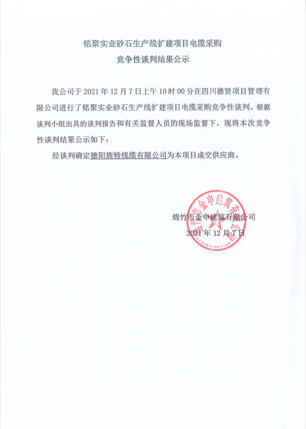 銘聚砂石生產(chǎn)線擴(kuò)建項(xiàng)目電纜采購談判結(jié)果公示