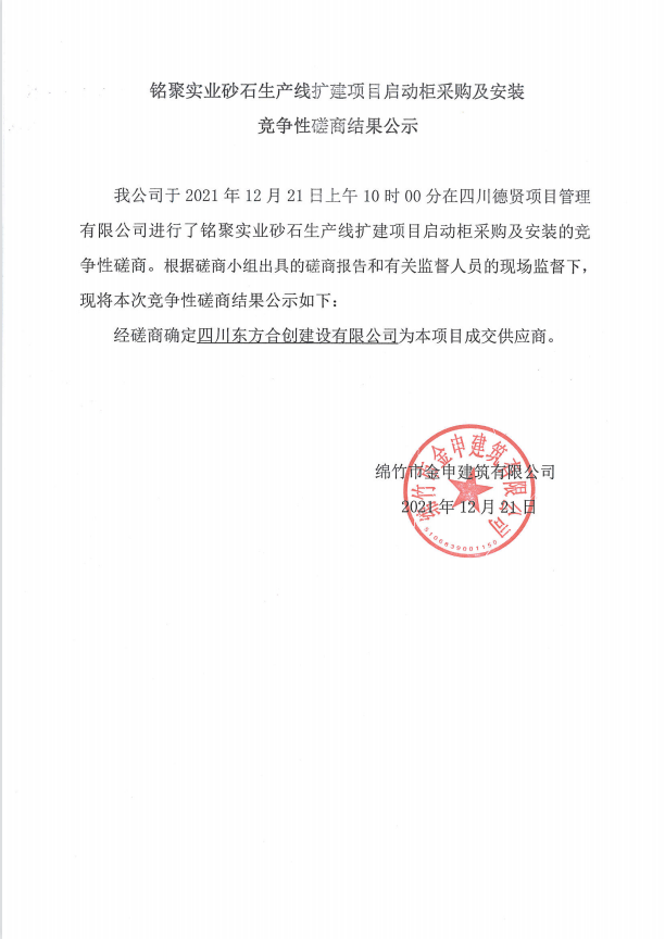 銘聚砂石生產(chǎn)線擴建項目啟動柜采購及安裝招標結(jié)果公示