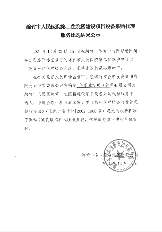 市醫(yī)院第二住院樓建設(shè)項目設(shè)備采購代理服務(wù)比選結(jié)果公示
