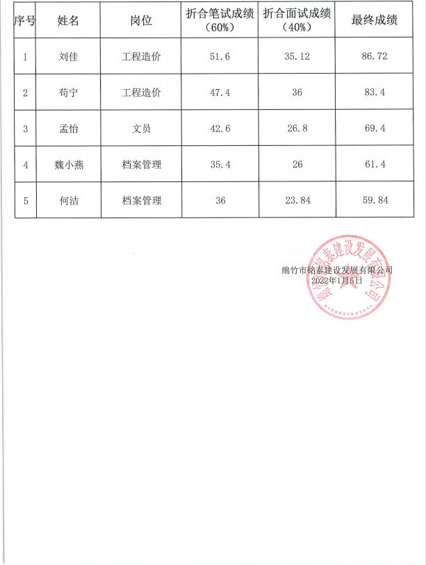 綿竹市銘泰建設(shè)發(fā)展有限公司2022年人員招聘成績公示