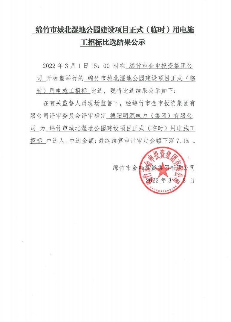 城北濕地公園建設項目用電施工招標比選結果公示
