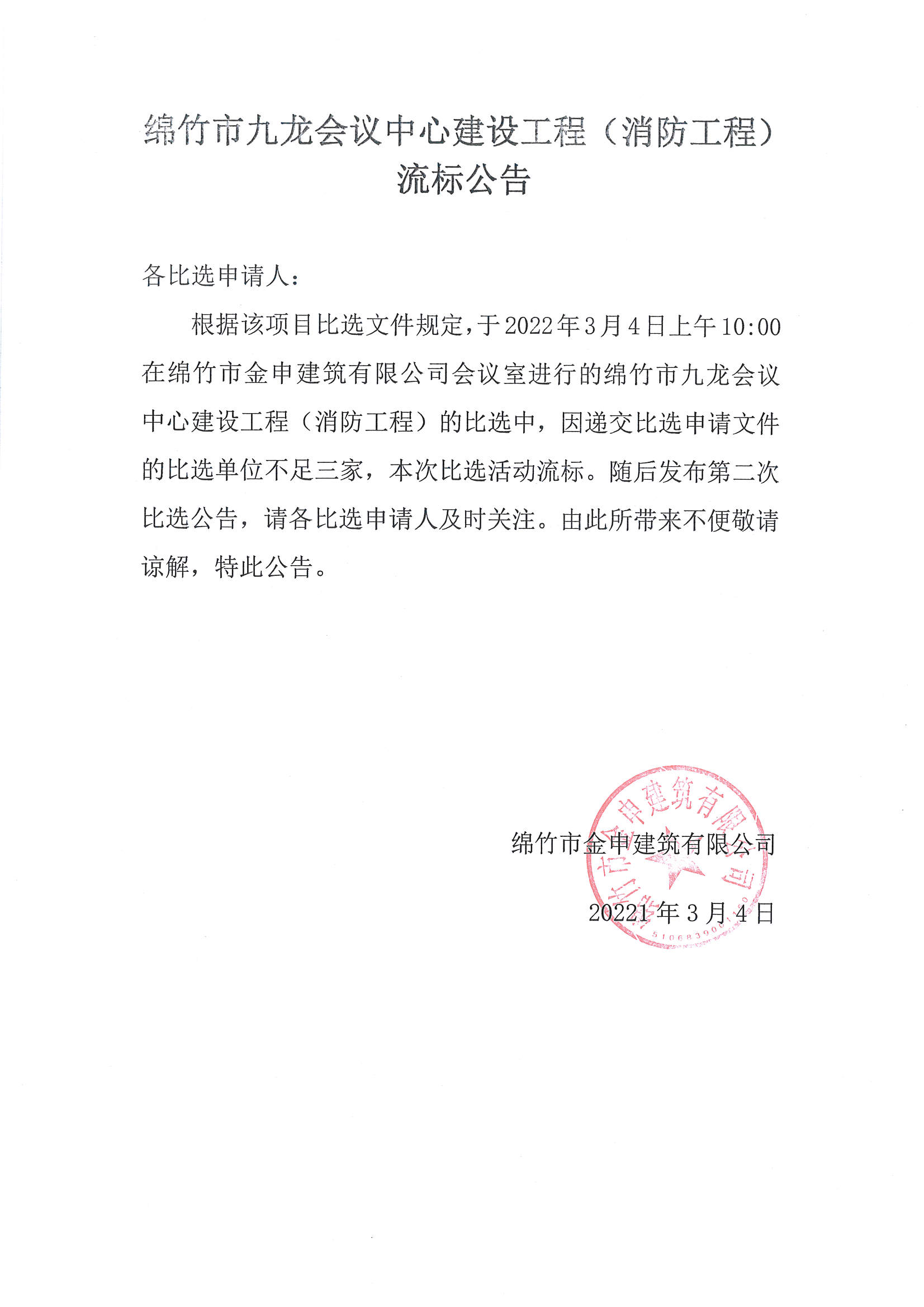 綿竹市九龍會議中心建設(shè)工程(消防工程)流標(biāo)公告