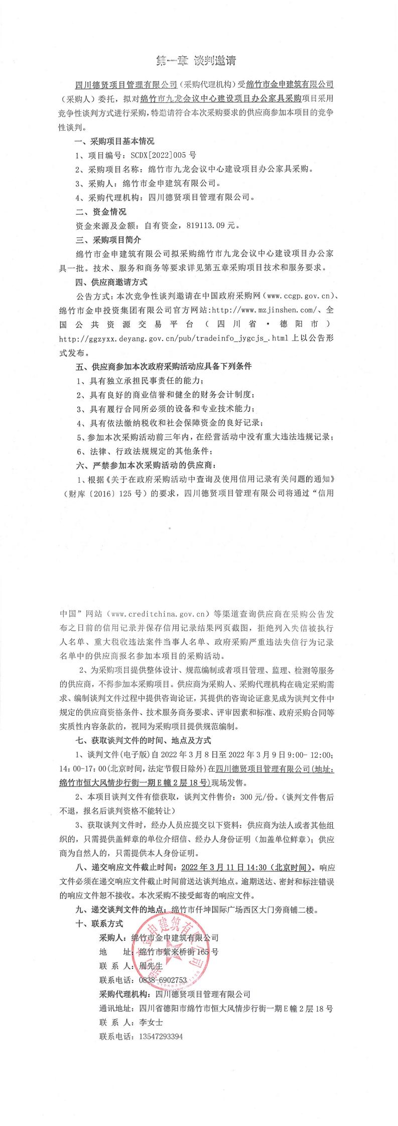 綿竹市九龍會議中心建設項目辦公家具采購談判邀請公告