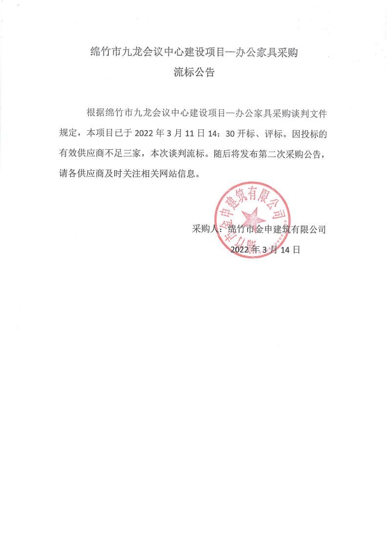 綿竹市九龍會議中心建設(shè)項目辦公家具采購流標(biāo)公告