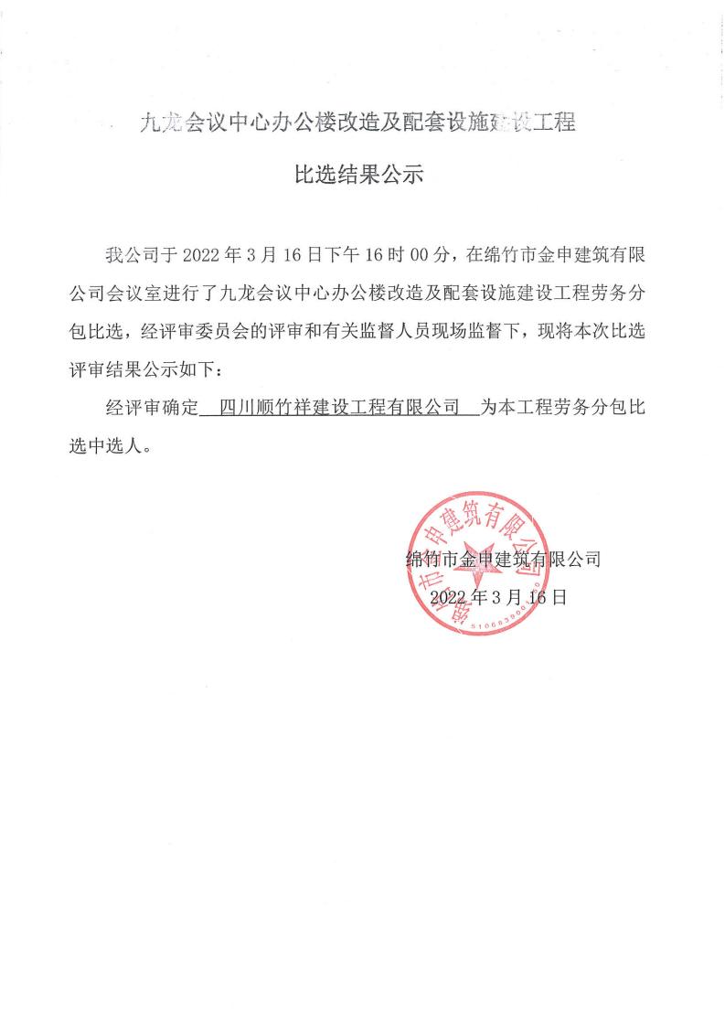 九龍會議中心辦公樓改造及配套設(shè)施建設(shè)工程比選結(jié)果公示