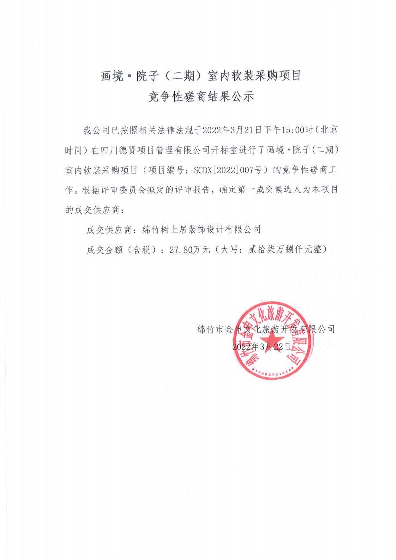 畫境·院子(二期)室內(nèi)軟裝采購(gòu)項(xiàng)目競(jìng)爭(zhēng)性磋商結(jié)果公示