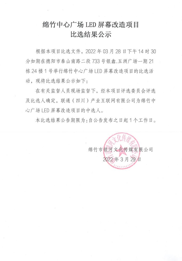 綿竹中心廣場LED屏幕改造項目比選結(jié)果公示