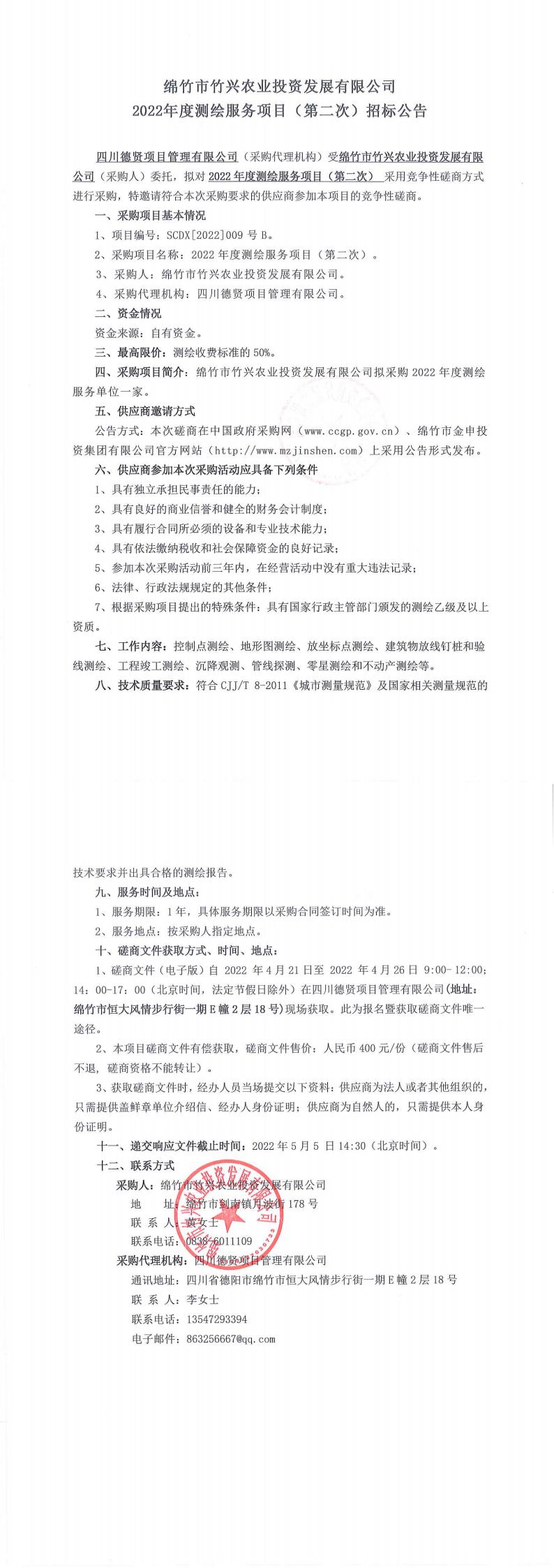 綿竹市竹興農(nóng)投公司2022年度測繪服務(wù)項(xiàng)目第二次招標(biāo)公告