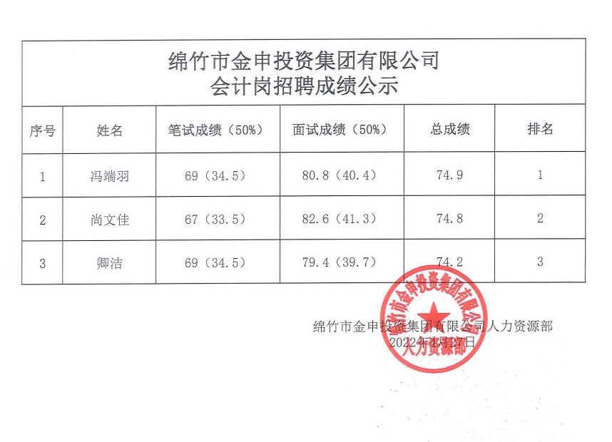 綿竹市金申投資集團(tuán)有限公司會計崗招聘成績公示
