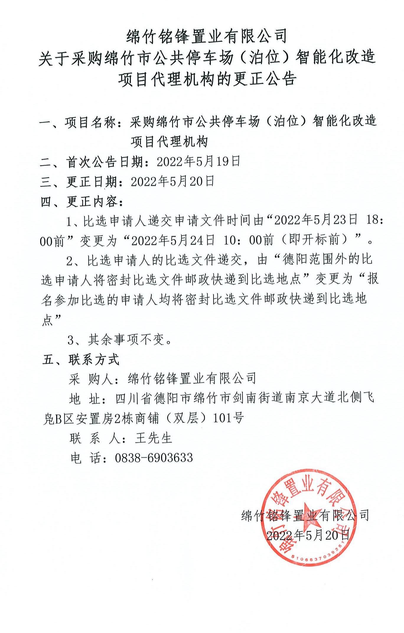 綿竹市公共停車場(泊位)智能改造代理機構(gòu)比選更正公告