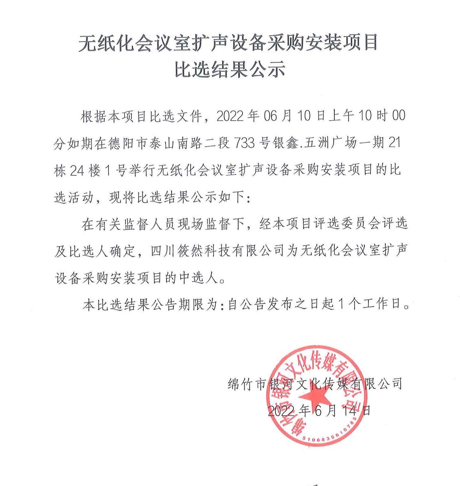 無紙化會(huì)議室擴(kuò)聲設(shè)備采購安裝項(xiàng)目比選結(jié)果公示