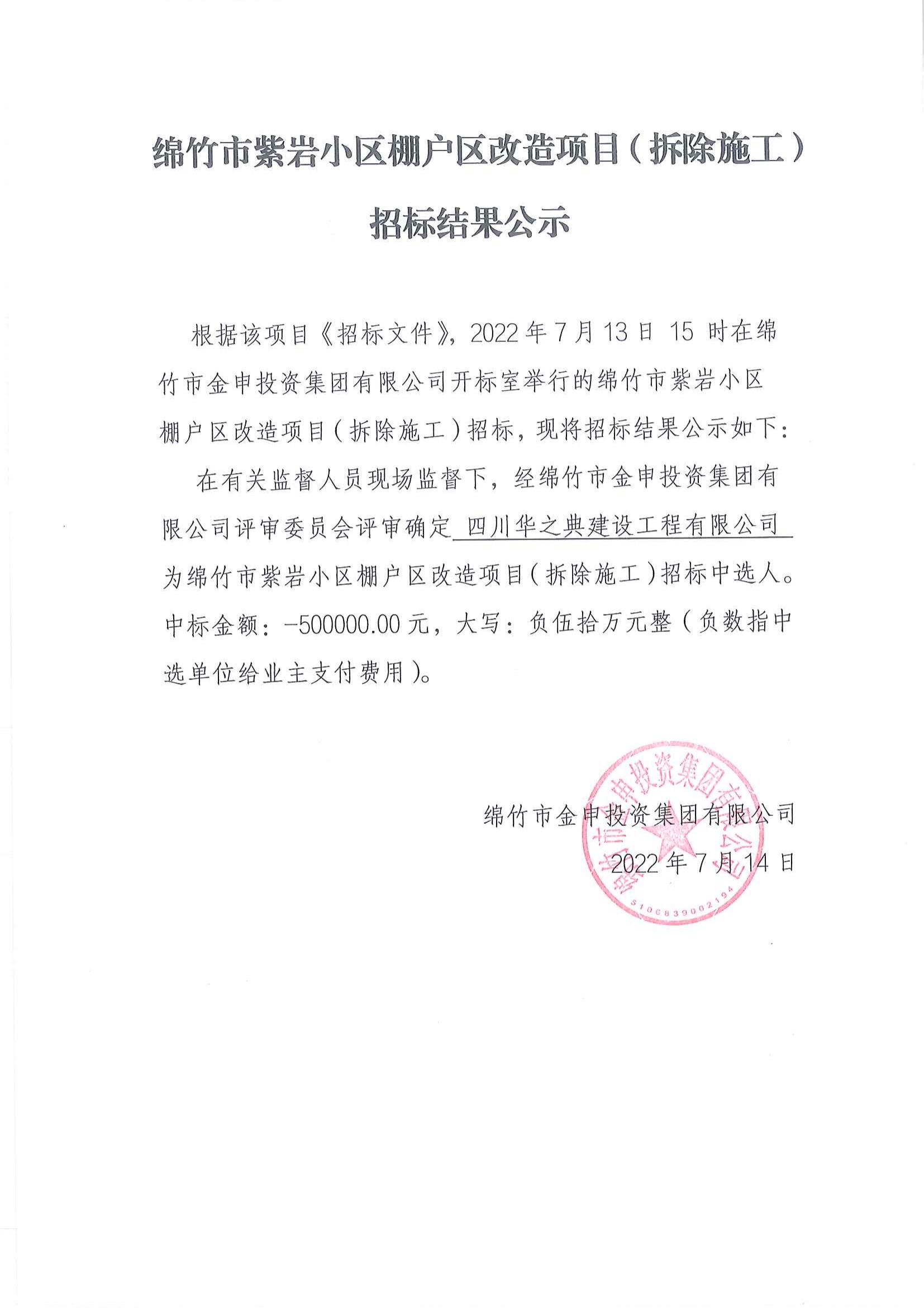 綿竹市紫巖小區(qū)棚戶區(qū)改造項(xiàng)目(拆除施工)招標(biāo)結(jié)果公示