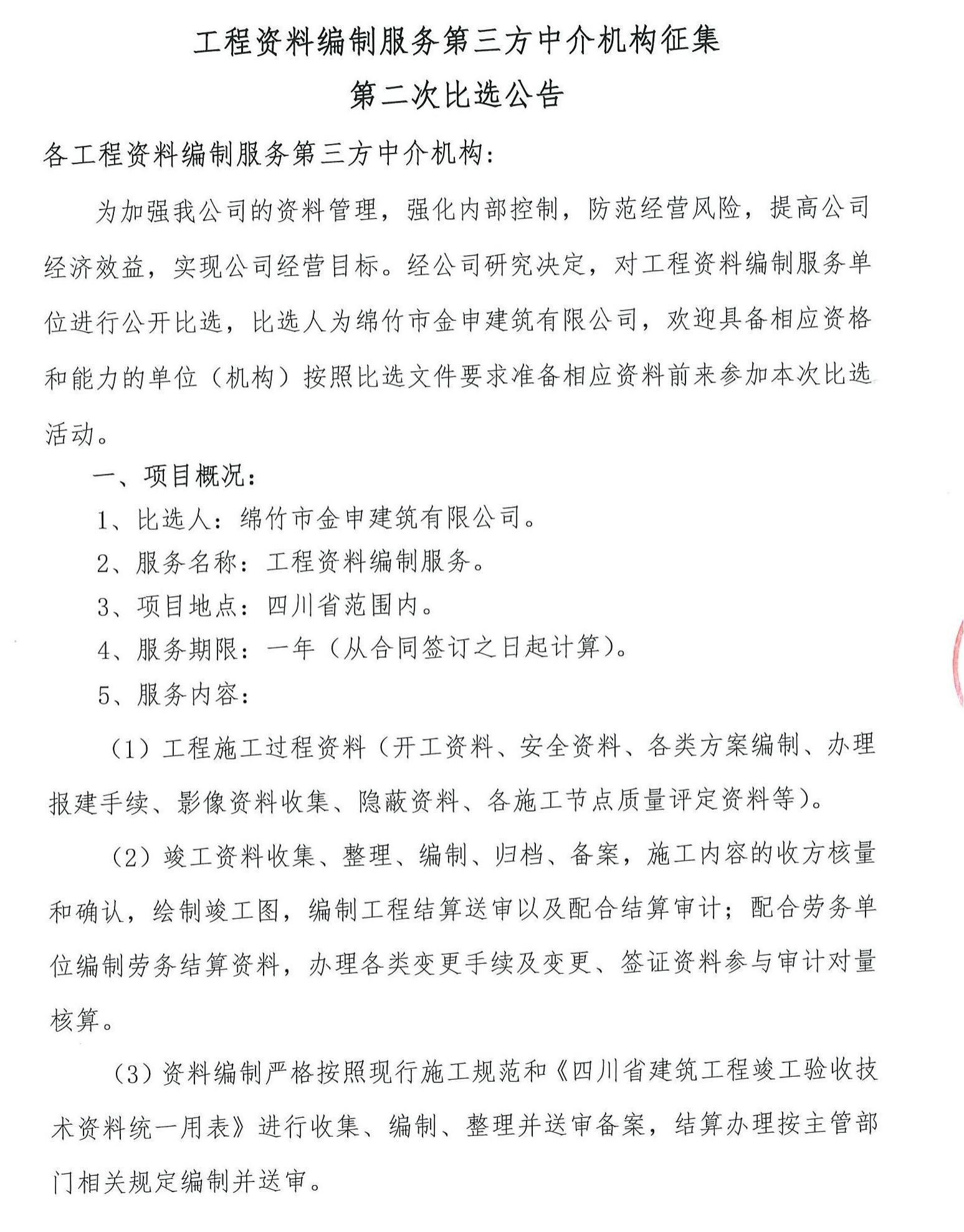工程資料編制服務(wù)第三方中介機(jī)構(gòu)征集(第二次)比選公告