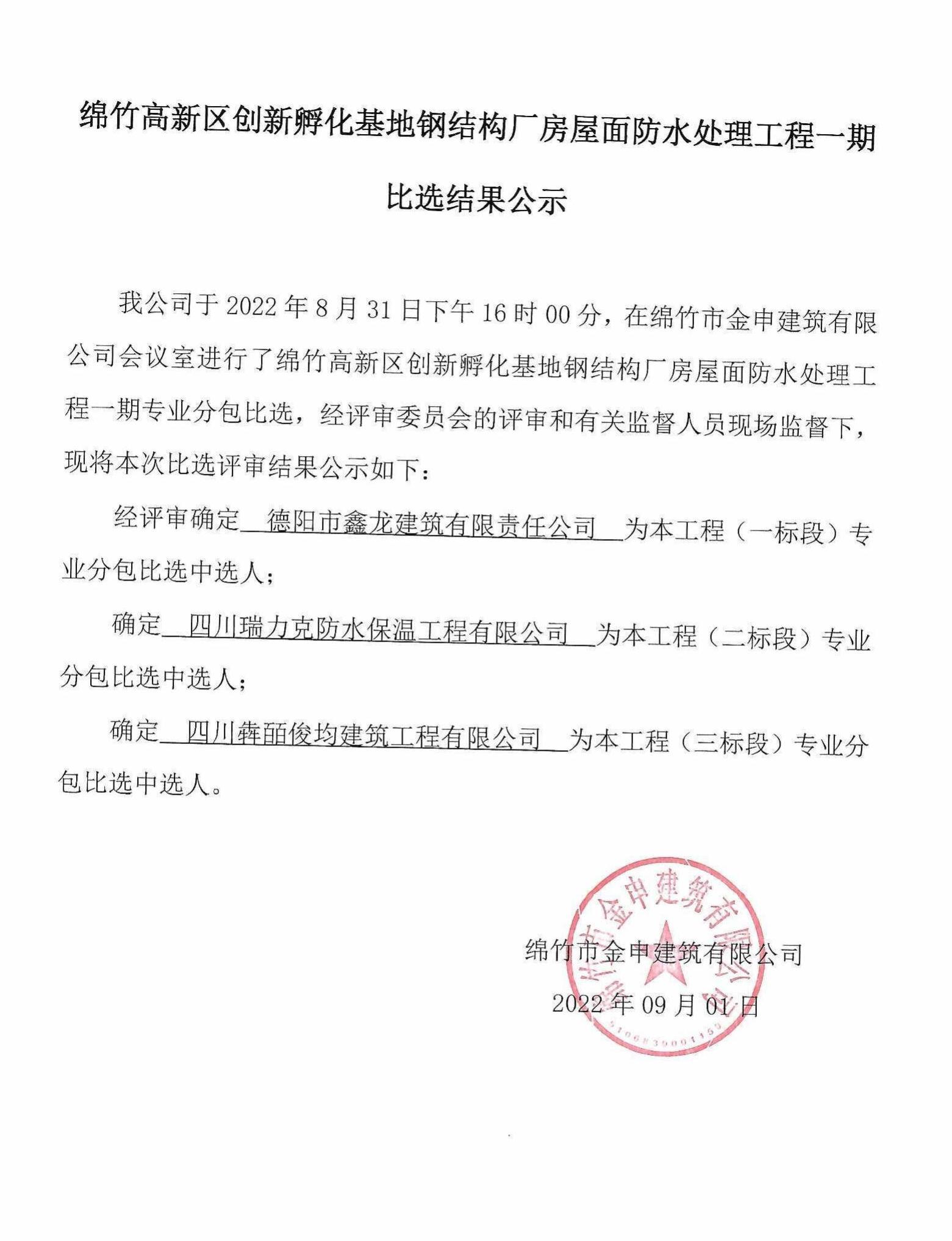 綿竹高新區(qū)孵化基地鋼化廠房防水工程一期比選結(jié)果公示